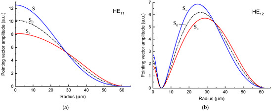 Profiles of the Pointing vector amplitudes of the HE11 and HE12 cladding modes for (a) coreless and (b) standard fibers, respectively, which are untwisted (dash-dotted curve, S0) and twisted with (solid curves). The red and blue curves are for the right and left circularly polarized modes (S+ and S−), respectively.