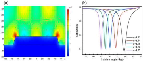 We would like to emphasize that in our study, we carefully controlled the grating period and the grating duty cycle. We performed the calculations at different grating cycles and adjusted the grating duty cycle correspondingly at each cycle so that the duty cycle is the same at different periods. While studying the grating duty ratio, we kept the grating period constant. This design ensures that we are able to analyze and differentiate the effects of the grating period and grating duty cycle on sensor performance. In addition, we investigated the change in sensor performance when the grating period was varied between 600 nm and 1200 nm in steps of 10 nm. A comprehensive analysis and a comparison of the sensor performance at each cycle were also performed. After experiments and calculations, we found that the sensitivity and FOM+ of the sensor reached their highest values at a grating period of 1100 nm. At this time, the sensitivity of the sensor is 441 deg/RIU, and FOM+ is 75.49. Compared with the initial structure, the sensitivity is increased by 145%, and FOM+ is increased by 182%. This indicates that the performance of the sensor is significantly improved at a grating period of 1100 nm, and therefore, we have chosen this period as the optimal design parameter. In Figure 2a, a distribution diagram of the magnetic field intensity is shown. In the metal layer, the magnetic field intensity increases sharply as it approaches the metal-to-object interface, and in the dielectric, the decrease in the magnetic field intensity is much slower. At the corners of the grating, the distribution of the electric and magnetic field components changes significantly due to the drastic change in geometry. This geometry results in the concentration or uneven distribution of the current in the corners, which in turn results in the distribution of the magnetic field in the corners of the trapezoidal metal diffraction grating. Therefore, the corners of a trapezoidal metal diffraction grating are areas in which the magnetic field distribution is concentrated or varies. This magnetic field distribution affects the propagation of light and interference phenomena, and thus the diffraction of light in the trapezoidal diffraction grating. Figure 2b shows the change in the absorption peak when the refractive index n of the sensing medium changes from 1.33 to 1.37 when p = 1100 nm. With the increase in the refractive index, the resonance angle of the absorption peak also starts to shift to a smaller angle, and the shift distance becomes smaller and smaller. In the subsequent study, the period p is also fixed at 1100 nm, so that the resonance angle occurs in the range of 60° to 85°.