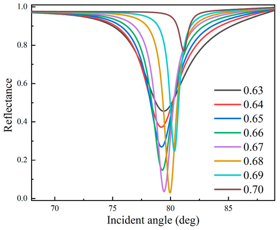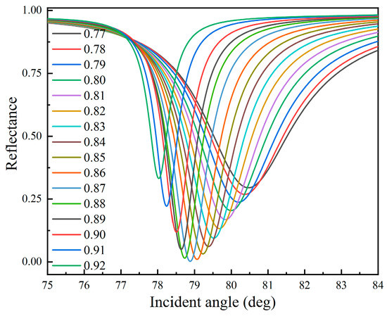 Due to the specificity of the trapezoidal grating shape, the influence of the trapezoidal parameter of the grating needs to be considered more than that of rectangular grating. After determining the previous parameters, the angular reflection spectrum was calculated for the change in the trapezoidal parameter from 0.77 to 0.92 for a refractive index of n = 1.33. The absorption peaks in the reflection spectrum started to move to a smaller resonance angle, and the intensity of the absorption peaks tended to be larger and then smaller. Meanwhile, the full width of the half peak of the absorption peaks also decreased continuously, as shown in Figure 7.