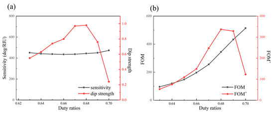 The sensitivity, quality factor and FOM+ at different duty ratios are further studied and calculated when the refractive index of the medium changes from 1.33 to 1.35. As shown in Figure 4a, with the change in the grating duty cycle, the sensitivity of the sensor fluctuates around 440 deg/RIU, and the absorption peak intensity first increases and then decreases rapidly with the increase in the duty cycle.
