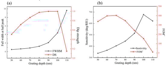 The performance parameters of the sensor were then calculated for different grating thicknesses when the refractive index of the medium was changed from 1.33 to 1.35, respectively. As shown in Figure 6a, with the increase in grating thickness, the half-peak full width of the absorption peak increases, and the intensity of the absorption peak first increases with the thickness, then reaches the maximum value and then starts to decrease rapidly. The calculated sensitivity also has an increasing trend, as shown in Figure 6b, and it drops sharply at the thickness of 110 nm. The FOM+ also shows a trend of uniform increase and then decrease, and it reaches the maximum value at the thickness of 70 nm, when the sensitivity is 403 deg/RIU, and the FOM+ is 403RIU. Compared to the FOM+ after optimizing the period and duty ratio by 20%, the loss in sensitivity is negligible in comparison.