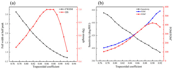 As shown in Figure 8a, it can be seen that the full width of the half peak decreases gradually from 3.13 nm to 0.71 nm during the change in the trapezoidal parameter from 0.77 to 0.92. The intensity of the absorption peak inclination first increases continuously until it reaches a maximum and then slowly starts to decrease. After calculating each performance parameter, the sensitivity and quality factor at each trapezoidal parameter were obtained along with the FOM+. As shown in Figure 8b, it can be seen that the sensitivity slowly decreases while the quality factor continuously increases, and the FOM+ starts to decrease after rising to its maximum value. Therefore, the grating trapezoid parameter was determined to be 0.89, at which point the sensitivity reached 405.5 deg/RIU, and the FOM+ was 409.8 RIU−1. Compared to the period, duty cycle and thickness of the grating after optimization, there is not much change, but the absorption peak depth has changed from 0.87 to 0.96, which is a 10% improvement.