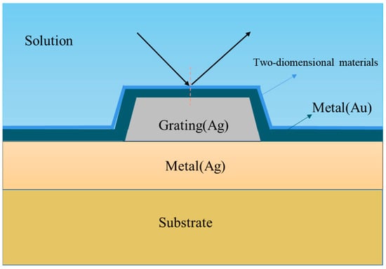 The schematic of the surface-coated bimetallic GCSPR sensor is shown in Figure 9. The exact methods and steps for inserting two-dimensional materials into gratings may vary depending on the actual design and experimental conditions. Depending on the need, two-dimensional material layers are prepared by chemical vapor deposition, mechanical stripping or chemical synthesis. A two-dimensional material with the desired shape and size should be obtained.