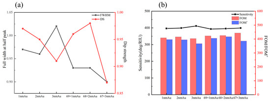 From Figure 10a, it can be seen that when directly covered with a thin Au layer, with the increase in Au film thickness, the absorption peak dip angle intensity also decreases. There is a change of about 1.0 in the half-peak full width. When the total thickness of the Au film and grating is kept at 70 nm, the thickness of the silver grating decreases with the increase in the Au film. The half-peak full width of the absorption peak obtained varies around 0.9, and the inclination intensity decreases substantially at 3 nm Au film. The values of sensitivity, FOM and FOM+ were then calculated as shown in Figure 10b. The sensitivity of the six cases in the graphs all fluctuate around 400 deg/RIU. But in the three cases with gold film and grating thickness kept 70 nm, the quality factor increases with the thickness in the gold film, and the FOM+ reaches the maximum at 68 nm Ag + 2 nm Au.