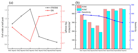 When different layers of graphene are used, the full width of the half peak of the sensor increases as the number of layers increases, and the intensity of the absorption peak dip decreases slowly. In contrast, when different layers of graphene oxide are used, the full width of the half peak decreases, and the inclination intensity increases slowly, as shown in Figure 11a. The calculated results are shown in Figure 11b. The three performance parameters of sensitivity, FOM and FOM+ decrease as the number of graphene layers increases, and the sensitivity is only 374.5 deg/RIU, with FOM+ as low as 189.8, when there are three layers of graphene. When using graphene oxide, the sensitivity slowly decreases as the number of layers increases. However, the lower full half-peak width and larger dip intensity keep the quality factor above 450, and the FOM+ fluctuates above and below 440.