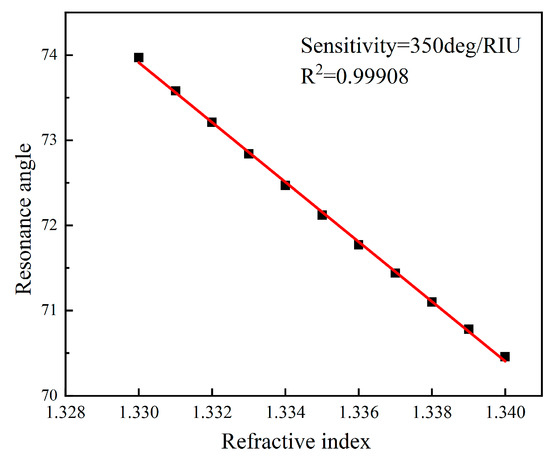 A grating SPR sensor with a double-layer graphene oxide bimetallic trapezoidal structure was selected for the analysis. When the refractive index of the medium to be measured is varied from 1.33 to 1.34 in steps of = 0.001, the displacement is perfectly linear, with a correlation coefficient of 0.99908. The slope of the relationship curve between the resonance angle and the refractive index of the medium to be measured is the sensitivity, which is 350 deg/RIU, as shown in Figure 12. The results of this research were compared with the results of other different surface-plasmon-resonance-based sensors, as shown in Table 1. In the obtained results, not only are the sensitivity and FOM higher than those previously reported for SPR sensors, but also the calculated comparison FOM+ shows a significant improvement over the previously reported results.