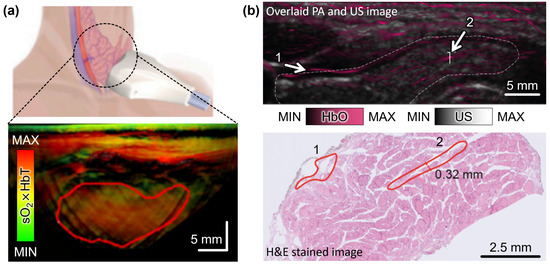 Multispectral PA analysis of thyroid nodules in vivo. (a) Schematic illustration and the resulting multispectral PA images in thyroid region. The pseudo color represents the sO2 level weighted with the signal of HbT. The red solid boundary indicates the nodule area. (b) Overlaid unmixed PA and US image and the corresponding H&E-stained histopathological image in thyroid region. Numbers indicate blood vessels. The white dashed boundary indicates the thyroid lobe. PA, photoacoustic; US, ultrasound; HbT, total hemoglobin; HbO, oxygenated hemoglobin; HbT, total hemoglobin; sO2, hemoglobin oxygen saturation; H&E, hematoxylin and eosin. The images are reproduced with permission from [68,69].
