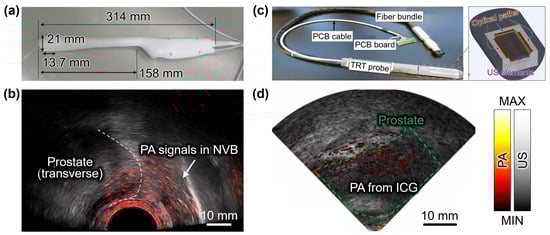 Dual modal PA and US imaging of NVBs in prostatic tissues from prostate cancer patients. (a) Photograph of the TRT imaging probe. (b) Overlaid PA and US images of the prostatic region. White dashed line indicates the boundary of the prostate. (c) Photograph and schematic configuration of the TRT imaging probe. (d) Overlaid PA and US images of the prostatic region after intravenous administration of ICG. PA, photoacoustic; US, ultrasound; NVB, neurovascular bundles; TRT, transrectal ultrasound transducer; PCB, printed circuit board; ICG, indocyanine green. The images are reproduced with permission from [79,81].