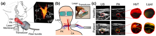 PAI has been also applied in the imaging of human carotid arteries, offering insights into potential disorders within these blood vessels by integrating with the conventional USI. Ivankovic et al. demonstrated a 3D multispectral PAI system for monitoring the bifurcation area of the human carotid artery, particularly in relation to ischemic stroke (Figure 4a) [82]. Their system utilized a hand-held HAT array capable of capturing 10 multispectral data points per second. A higher contrast-to-noise ratio was observed with wavelengths in the range of 800–900 nm (18.8 ± 4.28 dB) compared to shorter wavelengths of 730–760 nm (9.18 ± 3.8 dB), indicating that the carotid artery is a highly oxygenated vessel. Karlas et al. acquired multispectral PA images of the human neck area from five atherosclerosis patients, with the goal of comparing the levels of lipid and hemoglobin in healthy volunteers (Figure 4b) [83]. They used 28 wavelengths ranging from 700 to 970 nm with a 10 nm step, enabling the generation of a multispectral stack of PA images (Figure 4c). They also acquired US images co-registered to each PA image, and then manually segmented the regions of arterial cross-section, plaque, and lumen. Using spectral unmixing techniques, lipid and hemoglobin concentrations within the carotid artery were determined. The results demonstrated distinguishable differences in the fat–blood ratio between atherosclerosis patients and healthy volunteers, illustrating the feasibility of molecular imaging for human carotid atherosclerosis and the potential clinical assessment of carotid plaques. These studies showcase the valuable role of PAI in investigating carotid artery pathologies and highlight its potential for non-invasive assessment of vascular disorders.