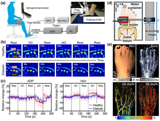 Vascular imaging has prominent applications of PAI in biomedical studies. Several research groups have achieved PA images for the evaluation of vascular function, especially peripheral vasculature assessment. Yang et al. demonstrated a vascular dysfunction monitoring PAI system for diabetic patients, employing a 128-element CAT array and a tunable pulsed laser with a repetition rate of 20 Hz (Figure 5a) [84]. Multispectral PA images of the dorsalis pedis artery and arterioles in the distal hallux region were acquired from seven diabetic patients and seven healthy volunteers, while a pressure cuff was applied to induce venous and arterial occlusions alternately (Figure 5b). The recorded PA signals indirectly reflected changes in blood volume (Figure 5c). Arterial occlusion led to a decrease in PA signals due to reduced blood volume resulting from arterial compression. Upon release of the pressure, the PA signal gradually recovered, with distinguishable differences in recovery time observed between the diabetic and normal groups. A noticeable time delay was observed in the arteries of the diabetic group (healthy: 14.66 ± 1.10 s, diabetic: 24.05 ± 5.36 s). In addition, a lower variation in PA signal was observed in the veins (healthy: 5.63 ± 0.024%, diabetic: 3.38 ± 0.331%), indicating decreased blood perfusion in the feet. These findings highlighted distinct vascular responses in the diabetic group compared to the healthy controls under occlusion. In a recent study, Choi et al. conducted in vivo morphological and physiological analyses of healthy human feet using 3D PAUS images [85]. To enhance the reliability of PAI, they implemented adaptive contour scanning of a 128-element LAT, tracking the curvature of the dorsal surface of the foot (Figure 5d). Several image processing techniques were applied to achieve comprehensive multi-structural visualization of the entire foot, including the skin, bone, and vasculature (Figure 5e). Quantitative analysis of parameters such as total hemoglobin concentration, vessel density, sO2, and vessel depth, obtained from five independent acquisitions of ten healthy volunteers, further evaluated the reliability of the system. The resulting images showed the potential of this technique to quantify the blood vessel activities and valuable insights into both morphological vessel networks and physiological sO2 distribution.