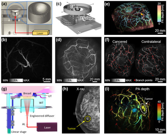 In a study by Wang et al., a fast and miniaturized system was developed to achieve deep tissue imaging of human breasts [72]. The system utilized a compact laser with a fixed wavelength of 1064 nm and a tunable pulse repetition rate (PRF) of up to 50 Hz to observe the distribution of blood vessels in human breasts (Figure 2a). The imaging probe consisted of a 128-element LAT operating at a center frequency of 5 MHz and a bifurcated fiber bundle. By scanning the probe in the elevational direction, 3D data were acquired from stacks of cross-sectional B-mode data, and landscape images were reconstructed using maximum amplitude projection (MAP) (Figure 2b). The total imaging time for one breast was 75 s with a scanning range of 75 mm. Nyayapathi et al. further developed the system by equipping it with two 128-element LATs with a center frequency of 2.25 MHz [73]. A translational scan was performed to achieve mammography-like images with the two LATs sandwiching the breast from both sides. The resulting images successfully identified blood vessels and their depth from the surface. The total scanning time for the whole breast was 80 s, making it feasible for clinical application. The same research group obtained PA images from 38 patients with breast tumors and found higher vascular activity in tumor-bearing breasts compared to healthy breasts [74]. These studies demonstrate the potential of PAI for breast imaging, as it allows for non-invasive and non-ionizing imaging of deep tissue structures. The development of compact and miniaturized systems with improved imaging speed and quality provides promising opportunities for the early detection and diagnosis of breast cancer.