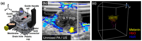 Volumetric PA images of cutaneous melanoma. (a) Schematic illustration of hand-held PA and US imaging probe with translational scanning of LAT. (b) Cross-sectional PA image of melanoma lesion overlaid on the corresponding US image. The yellow and blue arrows indicate the bottom boundary and invasion of melanoma, respectively. (c) Spectrally unmixed PA images with volumetric visualization from HAT. PA, photoacoustic; US, ultrasound; LAT, linear array transducer; HAT, hemispherical array transducer; TR, transducer; FB, fiber bundle; HbO, oxygenated hemoglobin; HbR deoxygenated hemoglobin. The images are reproduced with permission from [92,93,94].