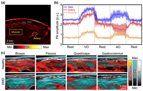 The hemodynamic responses that can be measured from PAI have been also utilized for analyzing the metabolic functioning of organs. Yang et al. conducted a study utilizing PAI to characterize circulatory and metabolic functions by monitoring hemodynamic changes in the forearm skeletal muscle during cuff occlusion [95]. They acquired multispectral PA images using a 128-element CAT with a diameter of 100 mm and a spanning angle of 174°. By monitoring PA signals from veins, arteries, and muscles during alternating venous and arterial occlusions (Figure 8a), a similar trend to the conventional near-infrared spectroscopy was observed (Figure 8b). This finding demonstrated the feasibility of the PAI system for imaging hemodynamic responses in both muscles and blood vessels. In another study, Regensburger et al. demonstrated the visualization of disease progression and treatment response in Duchenne muscular dystrophy (DMD) using multispectral PAI [96]. The spectrally unmixed PA signals determined the components of collagen, lipid, and hemoglobin in the muscles of 10 DMD patients and 10 healthy volunteers (Figure 8c). The results revealed a clear difference in collagen signal intensity between healthy subjects (14.60 ± 4.42) and DMD patients (24.72 ± 5.92). Volumetric images further showcased significant differences in oxyhemoglobin, deoxyhemoglobin, and total hemoglobin levels, underscoring the potential of multispectral PAI for monitoring DMD patients. Furthermore, Knieling et al. presented a preliminary study on the application of PAI for assessing Crohn’s disease, based on the correlation between hemoglobin content and intestinal inflammation [97]. Multispectral PA images were acquired from a total of 108 patients. The PA responses were compared between active and non-active patients, as determined by conventional scoring methods including the Harvey–Bradshaw index, simplified endoscopic score for Crohn’s disease, and modified Riley score. The initial results showed significant differences in oxyhemoglobin, deoxyhemoglobin, and total hemoglobin levels. These studies highlight the valuable role of PAI in investigating hemodynamic responses and metabolic functions, providing insights into the pathophysiology of various disorders, and monitoring treatment outcomes in a non-invasive manner.