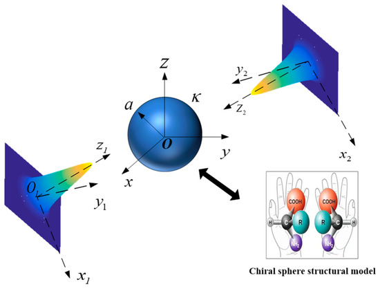 In this paper, the expansion of dual laser beams in a spherical system is obtained first, and then the scattered theory of chiral sphere by single beam is extended to dual laser beams. As shown in Figure 1, the subject researched here is the random irradiation of dual Gaussian beams with arbitrary polarizations on chiral particle system. To facilitate a better understanding of the chirality properties, we have provided molecular structures inside the chiral sphere that exhibit mirror-image enantiomeric characteristics in Figure 1. Suppose the radius of the chiral particle is , the sphere is located at system, and its center is coincident with center . The first laser beam transmits along direction in system , and its beam center is . The second laser beam propagates along positive direction in system and its beam center coordinate is . The beam centers and in the particle coordinate system are denoted as and . Take the first laser beam as example, we establish an intermediate system similar to the first laser beam system as presented in Figure 2a, the angles and indicate the arbitrariness of the propagation and polarization about the first laser beam, where is set as the angle between first beam transmitted axis and z-axis and refers to the angle between the first beam polarized orientation and x-axis. Similarly, and are set to be the angle of incidence and polarization of secondary laser beam. As presented in Figure 2b, represent the wave numbers of dual Gaussian waves. Since the case is the same with Figure 2a, only the representation of the angle is different, so the illustration is not repeated here.