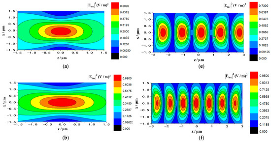In this part, numerical calculations taking into account the influence of variety of parameters, for example beam polarization form, waist width, particle radius, chiral parameters, particle refractive index, and material losses on RF, are analyzed in detail. Considering that there are few reports on optical trapping experiments in air, the main reason is that the high refractive index contrast between air and liquid makes it more difficult to achieve optical capture of a single beam in air than in liquid [66]. However, the standing beam configuration consisting of dual beams can offer sufficient chance to control airborne particles, as the capture is carried out with the amendments of radiation pressure. In general, creating a standing wave well requires two relativistic propagating laser beams carrying the same amplitude, the same frequency, and a fixed phase difference. In order to leave an intuitive show about standing Gaussian beam, difference between magnitude plots for the electric field of single Gaussian beam and Gaussian standing beam with varying waist width are given in Figure 3, in which, the single Gaussian beam travels in the direction and the standing wave consists of two Gaussian beams transmitting along direction and direction, respectively. All beams are denoted by RCP-polarization and wavelength . The electric field amplitude is denoted , the direction of standing wave is set , , and the beam center is , . It can be found that in Figure 3a–d, as the beam waist width increases, the electric field intensity distribution range gradually expands, at this time the convergence degree and the gradient force well will decrease, but the capture position is always at the center of the single beam. However, by contrast with single laser beam, the standing laser beam can form periodic nodes and antinodes as shown in Figure 3e–h, and since a battery of trapping points are constituted following the axis of wave propagation, the standing potential well can capture particles in multiple positions, which is the advantage of the Gaussian standing potential well compared with a single beam.