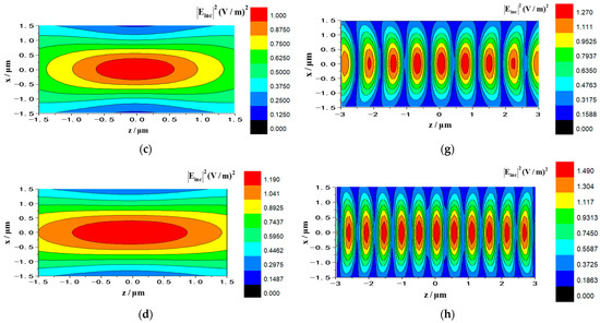 Illustrates the effects of waist width on the electric components of single progressive Gaussian beam and standing Gaussian beam. (a–d) The intensity distribution of single Gaussian beam. (The parameters are ). (e–h) The intensity distribution of Gaussian standing beam. (The parameters are ). The waist radii used are: in (a,e); in (b,f); in (c,g) and in (d,h).