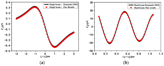 The axial RF for the degenerated chiral dielectric sphere is compared with the literature [28] results: (a) Comparison of the axial RF of particles irradiated by single laser beam. (b) Comparison of the axial RF of particles irradiated by dual laser beams. (, , , , , , , , , ; The relative refractive index ; The phase discrepancy ).