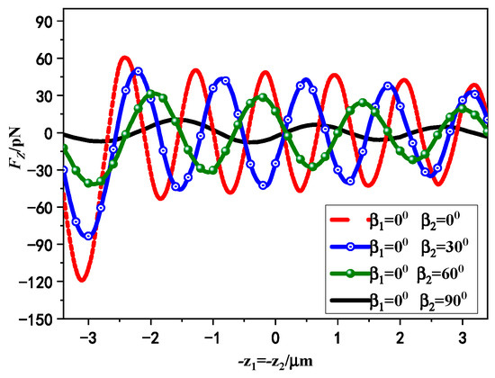 Figure 5 presents the variation curves of the axial RF of standing laser beams on chiral sphere with different linear polarization angles. The dual beams are both x-direction linearly polarized and transmits in the () and () directions, separately. The wavelength in the free space is and the waist width is . We set the first laser beam with the polarization angle , the corresponding angle of the second laser beam is taken as , respectively. The other parameters used in the calculation are as follows: the sphere radius is , the refractive index is , the chirality is selected . Note that the phase difference is zero in Figure 5 but not , where is a simulation relative to Figure 4b. A great deal of calculations indicate that the equilibrium point position has a little shift on the whole, but the relative relationships of equilibrium point position are not changed when the phase difference is not zero. In the remainder of this paper, the effect of phase difference will not be discussed. As shown in Figure 5, axial RF presents maximally if the polarized directions of standing laser beams are identical. This phenomenon is consistent with the results in Ref. [38], which indicates that the axial RF exerted on particles by standing Gaussian beams is identical when their polarization directions are the same or change synchronously. In other words, the axial RF curve for chiral particles only manifests if the polarized angle changes out of sync. The increasing difference will cause axial RF decreases due to the standing wave field’s influence under distinct polarization conditions. Notably, axial trapping presents smallest if the polarized directions of dual laser beams are perpendicular to each other. Furthermore, it can be observed that with the decrease of the polarization angle difference, more capture points appear, which means that the probability of capturing chiral particles by the standing Gaussian beams is enhanced.