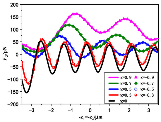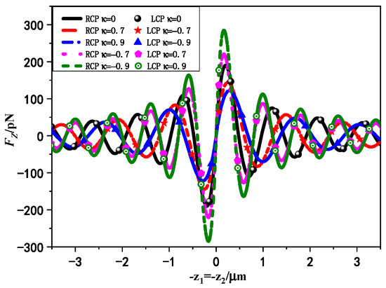 In Figure 7, we give the effect of circular polarization states on axial RF exerted on chiral particle by standing laser beams with varying chirality parameters. The dual Gaussian beams are the same as RCP or LCP incidence, respectively. Other parameters are consistent with Figure 5. It can be observed that the axial RF generated by the dual beams of RCP wave incident on chiral particle with negative chirality are equivalent to that of LCP wave incident with positive chirality. The following relations between the wave numbers of the two polarized waves satisfied . Based on this symmetry, it can be envisaged that the scattering of chiral particles with opposite chirality parameter by RCP or LCP beams is coincident. In both cases, the external intensity distribution of the chiral medium sphere is consistent. Furthermore, we can find that the capture ability of the axis RF will increase with the enhancement of chirality when the RCP standing wave incident chirality is negative and the LCP standing wave incident chirality is positive. Under the situation of the same RCP standing wave illuminate, the chiral medium sphere with negative chirality undergoes a larger axial RF than that with positive chirality, indicating that the axial RF produced by the RCP Gaussian standing wave is larger for the chiral medium sphere with negative chiral parameters. In addition, the distance between the stable capture points of negative chirality particles induced by RCP standing wave on the optical axis is smaller, which means that RCP Gaussian standing wave has greater probability of capturing chiral medium spheres with negative chiral parameters. Therefore, it may be easier to achieve axial trapping of chiral spheres using standing laser beams with suitable circular polarization.