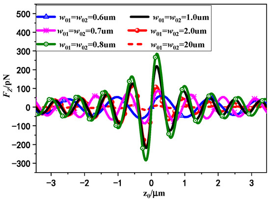 The variation curves of axial RF on chiral particle with different beam waist widths induced by circularly polarized standing laser beams. (, a = 800 nm, n0 = 1.0, n = 2n0, , , , , , and the phase discrepancy 0).