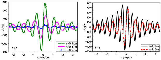 Figure 9 shows the variation curves of the RF on chiral particle with different radius by Gaussian standing beams. The standing wave consists of dual laser beams transmitting in the direction and direction, respectively, and the dual beams are the same with RCP incident and the waist width is . The relevant parameters are consistent with Figure 8. We chose the chiral sphere radius as , respectively, which includes the Rayleigh particles suitable for targets smaller than induced wavelength (e.g., Figure 9a) and the radial optic particles applicable for larger targets (e.g., Figure 9b). It can be observed from Figure 9a,b that there is always a capture position near the center of the beam for the selected chiral sphere of arbitrary radius. This is coincident with the phenomenon that dual relativistic propagating laser beams can create a series of stable points trap. Moreover, it can be seen from Figure 9a,b that the amplitude of the axial RF will gradually increase with the increase of chiral particle size, the axial trapping gradient well will increase. In addition, the equilibrium position clearly moves and the distance between the equilibrium points decreases continuously with the increase of the particle radius. In addition, it can be seen from Figure 9b that the standing wave field can provide larger axial gradient and more stable capture probability for large-size chiral spheres, which makes it easier to be captured by standing laser beam.