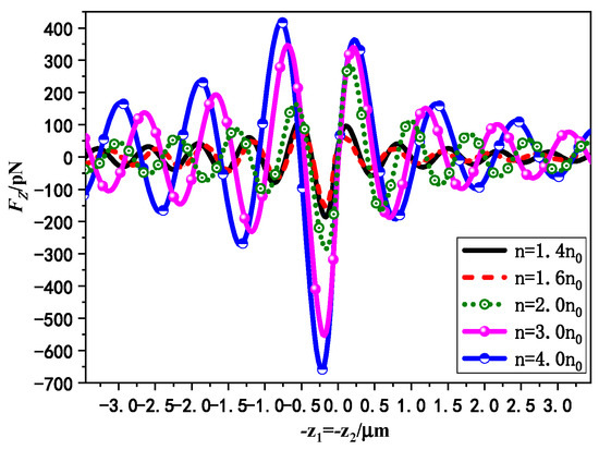 In Figure 10, the variation curves of axial RF on chiral particle by Gaussian standing beams with the position of the beam center for different particle refractive index are presented. The dual beams are coincident with RCP incidence and the waist width is . The spherical refractive indices are selected as , respectively. The rest of the parameters are consistent with Figure 8. It can be seen from Figure 10, as the particles refractive index increases, the axial RF on the chiral sphere by Gaussian standing beams will increase. Meanwhile, the distance between equilibrium points will increase, which indicates that the particle capture position becomes less. That is, chiral spheres with larger particle refractive indices become more likely to be stably captured by laser standing beams, while the smaller refractive index particles can achieve the sub-stable manipulation in more positions of the optical axis. In addition, it can be found that as the refractive index increases, the Gaussian standing beams have a larger capture negative slope in the range of the optical axis, which indicates that the particles in this range are being trapped more tightly by standing laser beams. This may be due to the particle refractive index being much higher than the circumambient environment one, causing the force generated by the optical potential well to be much greater than the scattering force, and the chiral particle with high refractive indices can be better trapped when it is in the region close to the standing laser beam focus.
