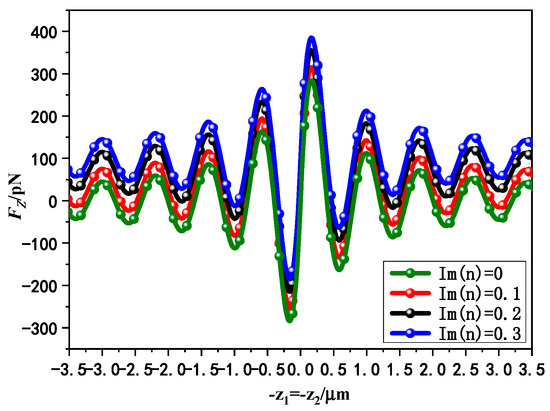 In Figure 11, the variation curves of axial RF on chiral particle by dual Gaussian beams with different particle losses () are presented. We take the range of refractive index imaginary part from 0 to 0.3, and keep other arguments consistent with Figure 8 except that waist width is . It can be seen from Figure 11 with the refractive index imaginary part increases, the position of the trapping point does not change significantly, which indicates that the probability of trapping chiral spheres is not affected by the introduced particle losses. In addition, the magnitude of axial RF on the chiral sphere by standing Gaussian beams will increase with the increase of the particle loss. However, the modulus of the negative trapping force exerted on chiral particles starts to decrease when the loss increases. This is because the number of photons absorbed by the chiral particles will increase when the loss increases, which leads to the fact that the scattering force gets bigger, resulting in a smaller trapping probability of particles by dual beams. It can also be found that with the increase of the chiral particle loss, the capture force on the particles far from the beam center begins to decrease until it disappears. At this time, the single beam will lose its trapping ability on chiral particles. However, under the same conditions, the standing wave trap formed by the dual Gaussian beams can still achieve axial trapping of high loss chiral particles. This is also the advantage of the dual Gaussian beams over the single beam in capturing chiral particles.