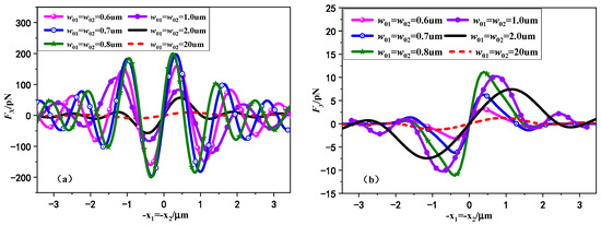 In Figure 12, the variation curves of lateral RF and on chiral particle by Gaussian standing beams with the different waist width are presented. Both beams are RCP incidence. The waist widths of the two beams are chosen to be the same. The relevant waist width here is selected as , and , respectively. The rest of the parameters remain the same as Figure 9. As shown in Figure 12, the transverse trapping phenomenon of chiral sphere is distinguished from that of achiral particle. For the general non-chiral isotropic dielectric sphere located on the -axis, the lateral RF component is always zero. However, we can observe from Figure 12b that the lateral RF of chiral sphere applied in the direction is not zero, and its absolute value will increase first and then decrease with the increase of the waist width. This is due to the interaction of two polarized waves in the chiral sphere, which indicates that the chiral sphere does not only move along the -axis in the transverse ( plane), but deviates from the -axis due to transverse forces in the y direction due to the combined transverse RF of the beam. In addition, it can be found that if the particle radius is comparable to the laser width, the magnitude of transverse RF of small beam waist width is usually a few orders smaller than , resulting in negligible influence of compared with . Therefore, selecting the appropriate waist width of the standing beams can produce more stable transverse capture of chiral particles.