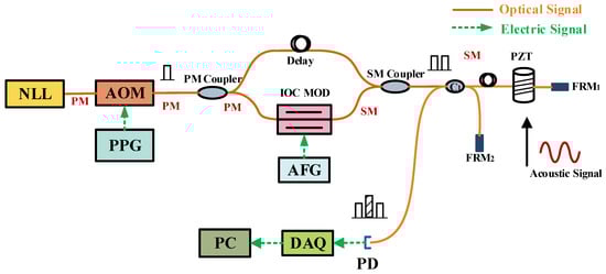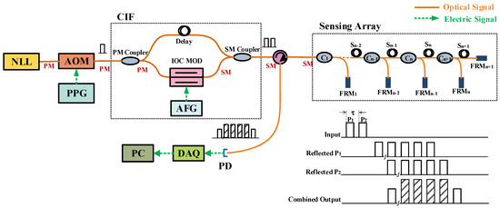 The proposed PMDI-FOH system using a PMDI structure is shown in Figure 1. The light emerging from a narrow-linewidth laser (NLL) passes through an optical isolator. Then, it enters an acoustic-optic modulator (AOM) to generate an optical pulse. The AOM is switched by a programmable pulse generator (PPG) with a duty cycle, which is determined by the number of sensors in the sensing array. Passing through the AOM, the pulse is split by a 50:50 PM coupler into an unbalanced Mach–Zehnder interferometer (MZI). The MZI, as the CIF, generates periodic dual pulses. The short path propagates through the IOC phase modulator (IOC MOD), and the long path is through a delay coil. The length of the coil is . The IOC MOD is modulated by an arbitrary function generator (AFG). The generated dual pulse injects into the sensing array through an optical circulator. The sensing array consists of several in-line Michelson interferometers (MIs). It uses several Faraday rotation mirrors (FRMs), 1 × 2 couplers, and delay coils. The length of each delay coil is L. They are also used as sensors in the system, labeled S1 ... Sn−2, Sn−1, Sn, and Sn+1. The couplers are labeled C1 ... Cn−2, Cn−1, Cn, and Cn+1. Additionally, the FRMs are labeled FRM1 ... FRMn−2, FRMn−1, FRMn, and FRMn+1. Notably, the FRMs applying a double pass efficiently cancel all polarization rotation effects in the delay fibers [9].