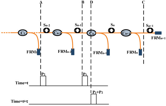 Additionally, it is essential to consider how pulse timing affects signal interference in a PMDI-FOH system. Figure 2 depicts the section of the sensor array in Figure 1. An unbalanced MI is created between positions B and C as a separate sensor, enclosing the Sn with FRMn and FRMn1, respectively. Due to the double pass time of the latter through each sensor, the first pulse P1 is ahead of the second pulse P2 by the separation time . At time t, pulse P1 enters the interferometer at position B, and pulse P2 enters the subnetwork at position A. The pulses will span at any time. Thus, the two pulse-span sensors, Sn−1 and Sn−2, will span. Then, the time differential interferometer is formed between A and C. It is clear that pulse P2 carries no phase information with respect to A at time t, while pulse P1 acquires a phase at B. At time , the first pulse P1, initially at B, has traveled twice through sensor Sn after reflecting from the FRMn to merge at position D with the second pulse P2. The pulse P2 has traveled through Sn−2 and Sn−1 and has reflected in mirror FRMn−1. At time , the phase received by P1 through the interferometer is , while the phase received by P2 is . In the detector, the common-mode phase information received by the two pulses returning together to the PD at location D is differenced, leaving only the net phase collected across the interferometer arms.