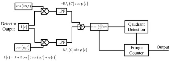 As is shown in Figure 3, the digitized PD signal is split into two streams in the PGC-Arctangent technique. They are multiplied by and separately, which is called up conversion [42]. After that, the mixing results are low-pass filtered to obtain in-phase signal and quadrature one , which be given as [10]: