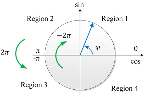 To correct the phase wrapping error, the fringe counter is used in the algorithm [22,43]. As shown in Figure 5 and Table 1 [43], the unit circle is divided into four regions according to the signs of in-phase and quadrature terms. The discrete baseband sequence , , , and are stored in memory. Once a transition from Region 2 to Region 3 occurs, the fringe counter value increases by . From Region 3 to Region 2, the fringe count value is decreased by . The fringe counter value accumulates in the arctangent operation process. Theoretically, the dynamic range is increased as the fringe counter value increases.