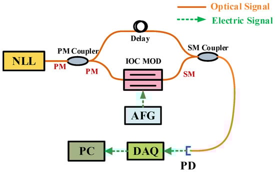 Based on the principal analysis in Section 2, an experimental set-up for phase-generated carrier signal measurements is built firstly to verify the effectiveness of the IOC-based phase modulation, as shown in Figure 6. A NLL with 17 mW output emitting at 1550.92 nm is used. The continuous light is generated from the NLL and it is passed through an unbalanced MZI. The unbalanced MZI consists of a PM coupler, a semi-custom IOC device, a SM delay coil, and a SM coupler. The length of the delay coil is . The measured data for the IOC used can be seen in Table 2. The AFG modulates the IOC modulator and a sinusoidally modulated signal is applied to the IOC device. To realize mentioned in Section 2, the peak modulation amplitude is set to with different modulation frequencies. The interferometric signal is received at the PD. The bandwidth of the PD is . The interferometric signal is captured by a high-speed DAQ card and processed on a personal computer (PC). The sampling rate of the DAQ card is