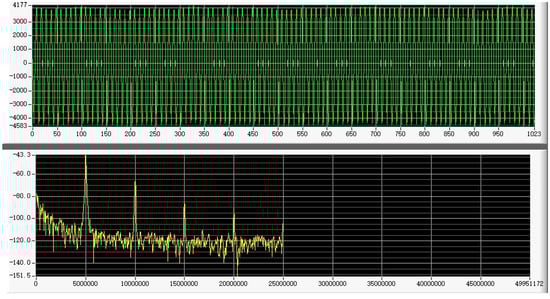The phase-generated carrier measurement experimental results are shown in Figure 7 and Figure 8. The time domain results of the interferometric signals are shown at the top of the figures. The interferometric signal’s power spectral density (PSD) analysis results are displayed at the bottom. Compared with Figure 7 and Figure 8, limited by the sampling frequency, the harmonic terms decrease as the phase modulation frequency increases. The modulation frequency should be at least two times the maximum signal frequency, and the interferometric signal spectrum contains baseband and harmonics frequencies. It can be concluded that the IOC-based system has the potential for accurate acoustic measurement because the harmonics of the frequency are sufficiently tiny with high modulation frequency. As the sampling rate is required at least eight times the modulation frequency for the PGC method [44], the modulation frequency of the IOC modulator in acoustic sensing experiments is set to 5 MHz.