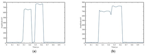 Then, the dual pulse measurement experiment setup is established, as shown in Figure 9. A high extinction ratio () AOM is used. The AOM converts the continuous light into a pulse. The AOM is modulated by a programmable pulse generator (PPG). The AFG sinusoidally modulates the IOC modulator. The PD receives the output waveform from the unbalanced MZI.