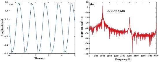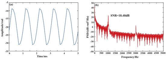 The output waveform and spectrum of PGC demodulation when the testing signal is 1 kHz with an amplitude of about 22.8 rad: (a) in time domain, (b) in frequency domain.