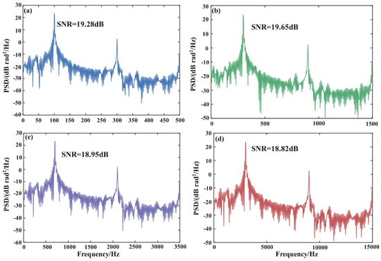 The acoustic sensing experiments are conducted as shown in Figure 11. The pulse width and repetition frequency are set to 200 ns and , separately. The IOC device is sinusoidally modulated with a peak amplitude of when the modulation frequency is . The demodulation results are shown in Figure 13, Figure 14 and Figure 15, which demonstrate that a high SNR of 20.28 dB can be achieved. Figure 15 shows that signals can be demodulated at a frequency of with an amplitude of approximately . Furthermore, the SNR can reach . Moreover, it also can be seen from the demodulation results that the SNR slightly decreases when the signal intensity rises.