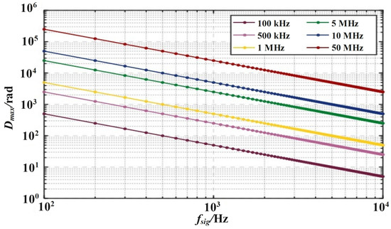 The simulation effect of the modulation frequency on the dynamic range is shown in Figure 16. When the modulation frequency is increased, the detectable frequency and the upper limit of the dynamic range are increased. The IOC-based modulator can achieve a high modulation frequency due to its high bandwidth. Therefore, the proposed scheme demonstrates advantages in large dynamic range and high frequency in hydroacoustic detection applications.