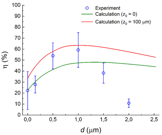 d ≈ 0.7 μm) when the efficiency is close to 80% (20% higher than that in the experiment). This difference can be caused both by alignment inaccuracy in the search for the optimal position