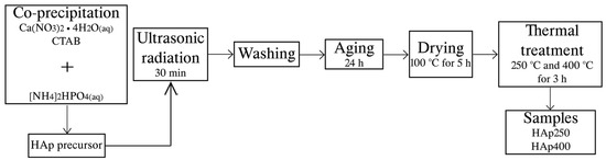 A solution of 0.1 M Trizma base was used to prepare the solutions of di-ammonium hydrogen phosphate and calcium nitrate. A solution of 0.37 M di-ammonium hydrogen phosphate ([NH4]2HPO4) was stirred at room temperature. Then, a 0.85 M solution of calcium nitrate tetrahydrate (Ca(NO3)2·4H2O) was slowly dropped into the phosphate solution. A solution of 0.2 M CTAB was added to the solution with constant stirring. The pH of the solution was adjusted to 10 ± 1 with ammonium hydroxide (NH4OH). After the precipitation, the mixture was sonicated in the Ultrasonic Processor (Sonics and Materials Inc., Newton, CT, USA) for 30 min at 70% amplitude and pulses of 2 s in active and inactive modes. The material was thoroughly washed with distilled water first, then with distilled water/ethanol (1:1) to remove the residual salts from the synthesis, aged for 24 h, and dried at 100 °C for 5 h in a Sev model MF3 muffle. Finally, the sample was ground in an agate mortar and then subjected to a thermal treatment at 250 °C and 400 °C for 3 h (Sev model MF3) to obtain the HAp powder. Samples were called HAp250 and HAp400 for the two different thermal treatments, as can be seen in Figure 1.