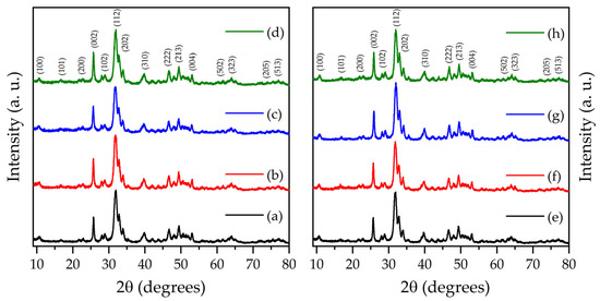 X-ray diffraction patterns of (a) HAp250, (b) HAp250-15, (c) HAp250-25, (d) HAp250-35, (e) HAp400, (f) HAp400-15, (g) HAp400-25, and (h) HAp400-35.