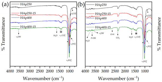 Fourier Transform Infrared (FTIR) spectra of HAp250, HAp250-15, HAp400, and HAp400-15 (a) at the first and (b) second measure.