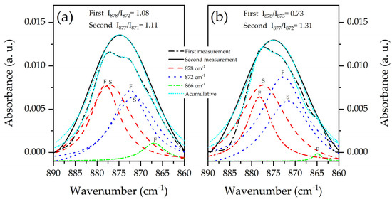 Deconvolution of the band at 875 cm−1 for samples (a) HAp250 and (b) HAp400, respectively, at the first and second measurements.