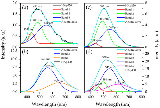 For the sample HAp400, the first measurement displayed a maximum emission band at 574 nm (Figure 9b) and the second one at 520 nm (Figure 9d). As with HAp250, HAp400 presented an increment in intensity, in this case about two times greater than the original measurement. At the first measurement, the photoluminescent emission was attributed to oxygen vacancies from PO43− ions and OH− ion vacancies [41,42]. In contrast, at the second measurement, the emission of the sample was referred to as oxygen vacancies from OH− and PO43− ions and OH− and Ca2+ ion vacancies [41,42]. These modifications can be explained by the FTIR results too, where the substitution A-type was favored at the second measurement of the sample (Figure 8b), and then the bands at 440 and 494 nm appeared.
