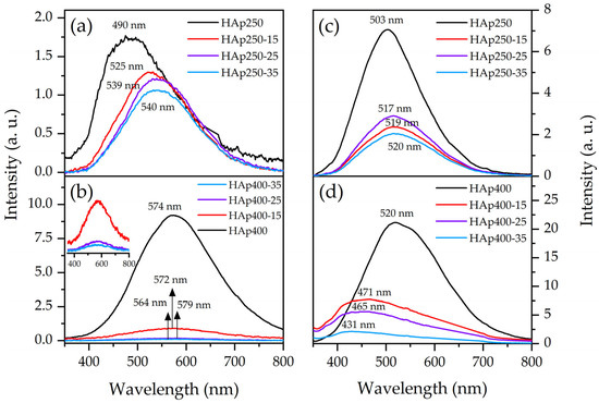 Photoluminescence spectra of HAp250 and HAp400 (a,b) at first and (c,d) at the second measures.