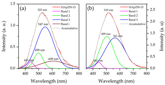Deconvoluted photoluminescent spectra of HAp250-15 (a) at the first and (b) second measures.