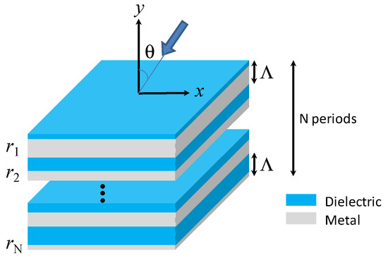 Resonant cavities of the Fabry–Perot (FP) type composed of metal–dielectric–metal (MDM) have been widely studied. These structures were used to design narrowband absorbers [26,27,28] and tunable optical filters [29,30]. For the development of these resonant structures, it is necessary that the strict condition n = κ is obeyed, where n is the refractive index of the dielectric and κ is the metal extinction coefficient. In our work, the goal is to design multiple resonant cavities to develop a broadband absorber. The schematic of the proposed absorber is shown in Figure 1. The optimization tools are used to find the ideal thicknesses for maximum absorption.
