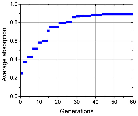 Since we considered a large number of individuals (50) per generation to increase the probability of obtaining a good number of possible candidates with a high absorption during the optimization process, we adopted the following stop criteria: maximum number of generations = 100 or number of generations without changes in the average absorption = 15. Figure 4 shows the evolution of the average absorption of the best individual as a function of the number of generations when assuming Ag as metallic layers. For this particular case, the stop criterion was the number of generations without changes, and the optimization stopped at generation number 60. Similar behavior has been observed for the other two metals.