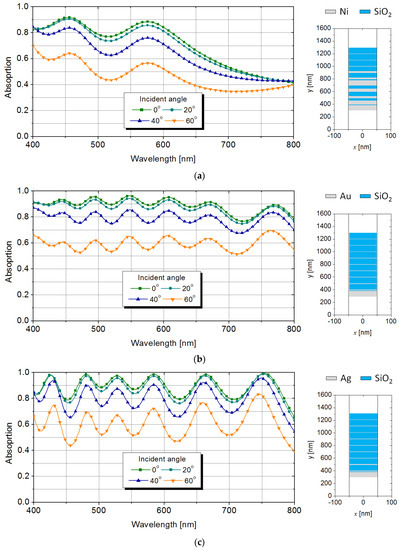 Figure 5 shows the absorption behavior of the structure composed of SiO2 and metal (Ni, Au, and Ag) for different angles of incidence, downwards, after optimization using GA.