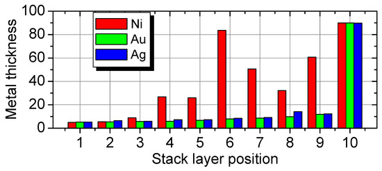 According to Table 1, which shows the thickness of the metals in each pair, and Figure 7, it is possible to observe that for Ag and Au, the thicknesses of the metals are much smaller than the penetration depth, as seen in Figure 2. This fact explains the high absorption, in normal incidence, in the structures composed of Au or Ag; the field can penetrate all pairs except forpair number 10, as seen in Figure 6b and Figure 6c, respectively. For Ni (see Figure 6a), the field can only penetrate up to pair number 3; for all other pairs (4–10), the thickness of the metal is much greater than Ni’s penetration depth, and the field cannot be absorbed in these pairs.